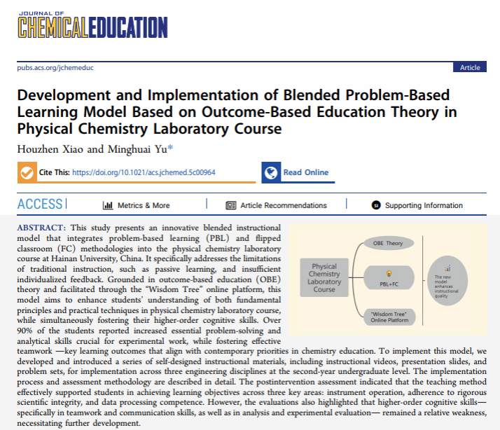 基础化学实验教学中心的重要教学研究成果“Development and Implementation of Blended Problem-Based Learning Model Based on Outcome-Based Education Theory in Physical Chemistry Laboratory Course”(J. Chem. Educ. 2026, DOI:10.1021/acs.jchemed.5c00964)在美国化学会旗下的《Journal of Chemical Education》(JCE)上发表。基础化学实验教学中心肖厚贞老师为论文第一作者,91大神