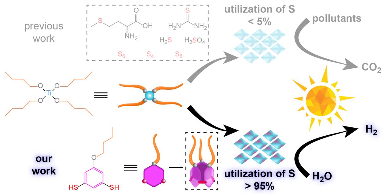 二氧化钛因其性质稳定,无毒且可大量工业生产而被视为未来最有发现潜力的光催化剂,但其只能吸收波长小于387 nm的紫外光而导致其对光能的利用率不高,利用可见光光催化分解水制氢的性能极低。因此通过改性开发具有可见光响应的二氧化钛显得尤为重要,这其中硫掺杂二氧化钛可使二氧化钛的光响应范围提升至可见光区间,但目前利用硫脲、单质S等一系列含硫掺杂剂制备有S-TiO2的工艺存在硫掺杂二氧化钛的控制合成及批量制备技术尚未成熟、制备表面S掺杂量为约0.8-1.0 wt %的硫掺杂二氧化钛材料需要等量甚至几倍于二氧化钛的量的掺杂剂加入且S元素在材料制备过程中大量流失,原子利用率极低导致掺杂剂用量巨大,经济效益低,未来工业化生产过程中大量的掺杂剂在催化剂制备过程中会产生大量的废弃物排放,对环境影响较大等不利因素。而大量的硫化物与碳化物排放除了会导致空气质量下降、温室效应加剧甚至还会加速酸雨的形成,在能源开发与环境保护冲突日益加剧,碳中和被提上国际议程的当下,如何改善制备工艺来减少硫化物与碳排放并提升硫掺杂二氧化钛的可见光催化性显得格外有趣。