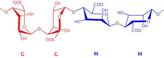 SA作为一种从褐藻中提取的天然可再生阴离子多糖,其β-D-甘露糖醛酸(M单元)间以 β-1,4 糖苷键相互连接,呈现线性和柔性构象;而α-L-古露糖醛酸(G单元)间以 α-1,4 糖苷键相互连接,呈现折叠和刚性构象,从而使SA分子具有较大的空间体积,其结构式如图1所示。