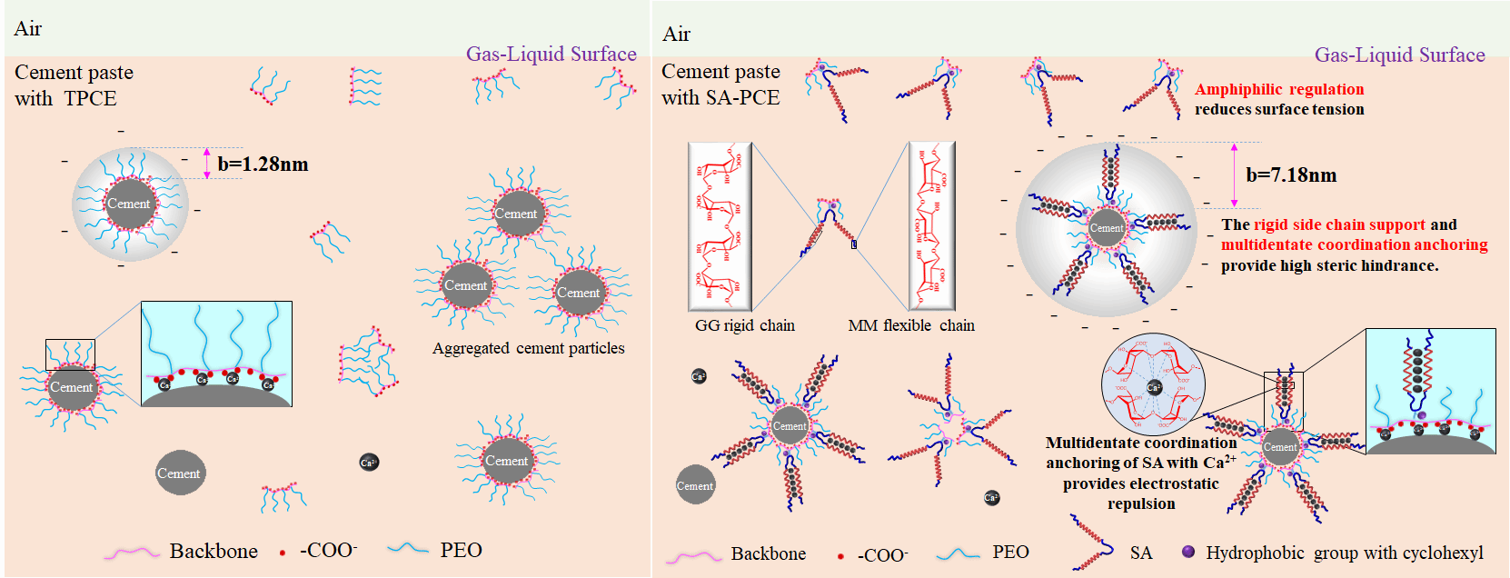 引入Ugi-SA功能单体后, SA-PCE打破了TPCE线性构象局限,具有更高的分散性能,同时减轻了功能单体对石油原料的依赖。并阐述了其作用机制,如图2所示:引入的侧链结构Ugi-SA中的SA结构使SA-PCE具有刚性侧链支撑、更强的Ca2+多齿螯合作用和空间位阻、更高的羧酸根密度和静电斥力,同时疏水基团环己基的引入使SA-PCE具有可调控的两亲结构和更高的表面活性及润湿性。SA的刚性结构支撑和多齿配位锚固协同环己基的两亲性调节,发挥优良的分散性能。