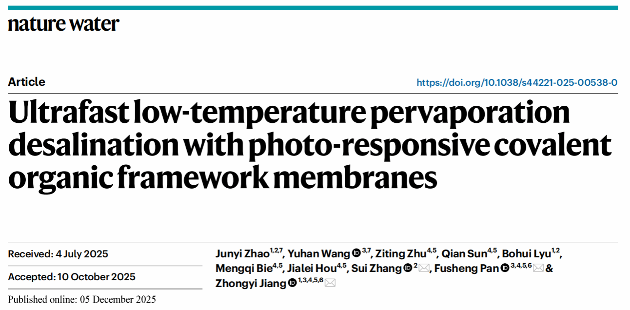 姜忠义、潘福生团队在《Nature Water》上发表题为“Ultrafast low-temperature pervaporation desalination with photo-responsive covalent organic framework membranes”的研究成果。该团队创新性地提出一种太阳能-真空双驱动脱盐系统,利用光响应共价有机框架(COF)膜,在30℃低温下实现了媲美传统70℃高温脱盐的水通量,并保持>99%的盐截留率。91大神