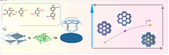 氢燃料电池作为高效、零碳排的能源转换装置,其核心部件质子交换膜的性能直接决定着电池的效率和寿命。共价有机框架(COFs)是一类由共价键连接形成的结晶多孔聚合物材料,具有结构可调、孔道规整、稳定性好等特点。其中,二维的共价有机框架纳米片(CONs)因其纳米厚度和易于成膜的特性,已成为质子传输领域备受关注的膜构筑基元。然而,CONs片层间连接不足会导致其膜材料的完整性和致密性有所牺牲。此外,孔道纳米结构与质子传导率之间的直接关联尚不明确。