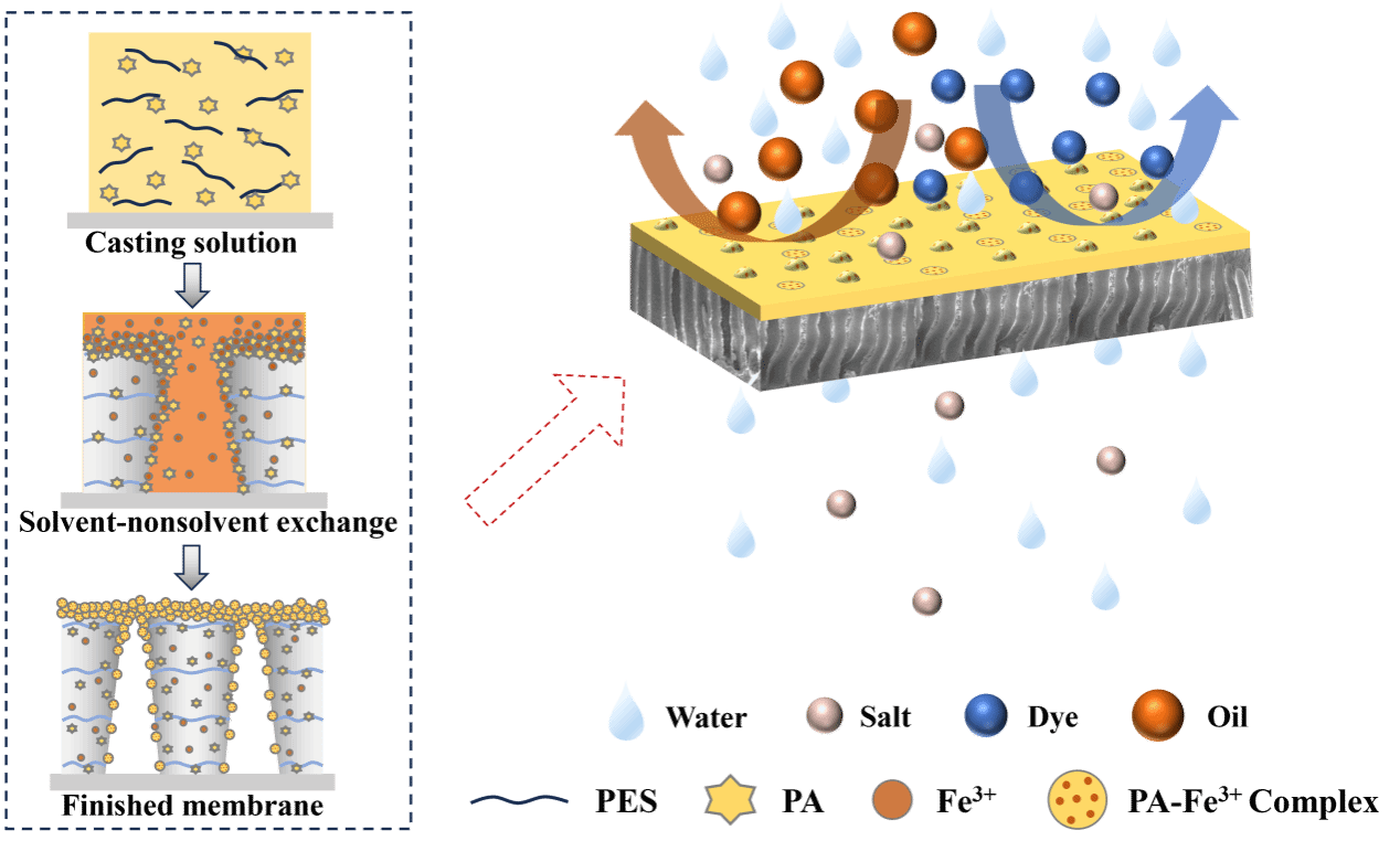 姜忠义教授团队提出了一种基于络合作用的反应增强表面偏析方法,用于制备面向分子/离子分离的抗污染纳滤膜。在铸膜液中引入亲水性植酸(PA)作为表面偏析剂,并在凝固浴中选用具有强络合能力的Fe3+作为交联剂。PA与Fe3+之间的络合作用增强了PA的表面偏析,使PA-Fe3+络合物稳定附着于膜表面,从而构建出亲水且交联的分离层。实验结果表明,优化后的膜表现出优异的性能:水通量为253 L/(m⟡·h·bar),对多种染料具有高截留率(甲基蓝:97.9%,日落黄:96.3%,酸性品红:95.5%,甲基橙:78.8%),染料/盐分离因子超过300,且在表面活性剂稳定的泵油水乳液过滤中通量恢复率超过95%。同时,在连续168小时过滤混合溶液(100 ppm甲基蓝/1000 ppm NaCl)过程中,该膜始终保持对甲基蓝的高截留率与对NaCl的低截留性能。91大神