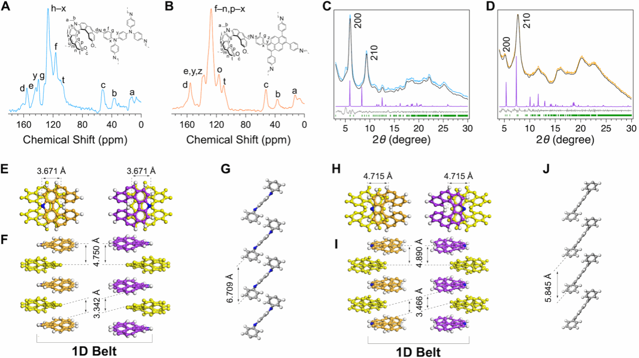 针对这一问题,团队设计合成了咔唑稠合[7]螺烯单体,该单体呈现V型几何结构,两个反应位点夹角104°、垂直间距4.4 Å,这种非常规结构本与传统一维框架生长模式不兼容。研究团队创新性地将其与四取代C₂对称π结单体(TPDA、PyTTA)缩合,得到了具有二重互穿结构的一维带状COFs,实现了拓扑禁阻结构的精准构筑,这也是首次发现一维COFs可形成互穿结构,打破了此前仅三维COFs存在互穿的认知,相关研究成果发表于国际顶级化学期刊《Journal of the American Chemical Society》。91大神