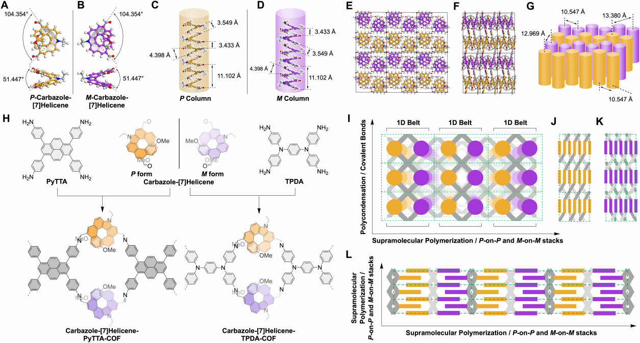研究发现,该类一维COFs中P型和M型螺烯异构体沿带状结构两侧实现手性自分类,分别排列在带的两侧边缘,这些一维带进一步通过同手性的P-on-P和M-on-M柱间的π-π堆积作用,自组装成"伪2D"框架,构建了有序的电子给体-受体列阵,大幅提升了电荷传输效率。结构表征显示,两种新型COFs(咔唑-[7]螺烯-TPDA-COF、咔唑-[7]螺烯-PyTTA-COF)均为三斜晶系P1空间群,具有良好的化学稳定性,在有机溶剂及酸碱水溶液中均能保持结构完整,且其微孔结构(孔径1.4 nm)和适度的亲水性为反应底物的传输提供了有利条件。
