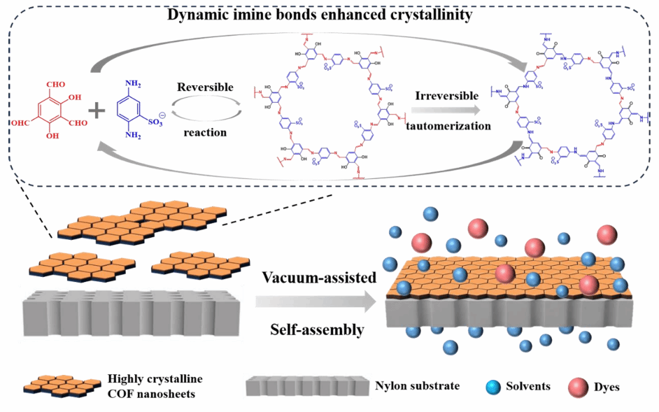 随着石油化工、制药和化工等行业中有机溶剂使用量的不断增加,大量含溶剂废水的持续产生带来了严峻的环境挑战,对溶剂回收与循环利用提出了迫切需求。有机溶剂纳滤因能耗低、工艺紧凑且无需复杂化学反应即可回收溶剂,被公认为有效的解决方案。然而,有机溶剂纳滤的分离环境通常较为苛刻复杂,对膜材料的耐溶剂性、孔道规整性和可规模化制备提出了严格要求。共价有机框架(COF)因其有序的晶体网络、可调的孔径、规整的纳米通道以及有机溶剂中优异的结构稳定性,被认为是构建有机溶剂纳滤膜的理想材料。而COF纳米片的结晶度是高性能COF膜的关键,针对这一关键科学问题,该团队创新性地采用不对称醛单体2,4,6-三氟间苯三酚(TFR)与2,5-二氨基苯磺酸(Pa-SO3H)反应,通过促进可逆键交换和结构重组过程,合成了高结晶性的COF纳米片,并进一步通过真空辅助自组装制备了COF膜。TFR的不对称结构使其在反应中部分发生不可逆的烯醇-酮互变异构形成稳定的β-酮烯胺键,同时保留部分可逆的亚胺键,显著提升了COF纳米片的结晶度。
