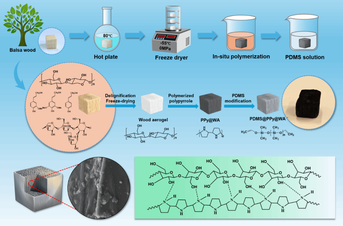 海上溢油事故严重威胁海洋生态安全与人类生产生活,低温环境下原油黏度急剧升高会导致分离效率大幅下降。传统电加热、光热加热、磁加热等单一降黏方式分别存在能耗高、受昼夜天气制约、材料易团聚等短板,而现有三维多孔分离材料又普遍面临机械强度低、易结构坍塌、含氟改性剂存在环境风险等问题,难以满足全天气候、大规模海上溢油应急处理的实际需求。针对上述行业痛点,本研究以绿色可再生的轻木为原料,通过精准的脱木质素工艺制备出保留天然多级多孔骨架的轻质木材气凝胶(WA),再经聚吡咯(PPy)原位聚合与聚二甲基硅氧烷(PDMS)无氟表面改性,成功构建了PDMS@PPy@WA多功能超疏水复合气凝胶。该材料完整保留了木材的三维多孔结构,兼具超疏水性、快速热响应性与优异的力学化学稳定性:水接触角高达159.30°,可承受自身3780倍重量的压力,在pH=3强酸与pH=12强碱环境中浸泡72小时性能无明显衰减。