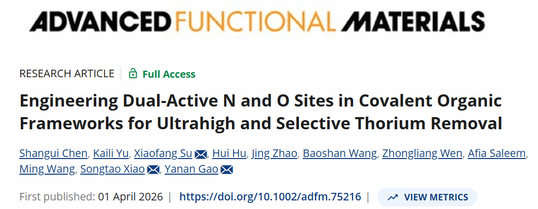 能源材料先进制造与应用团队基于软硬酸碱(HSAB)理论,设计合成了一系列富氧基团功能化的亚胺键连接二维共价有机框架(2D COFs)。凭借骨架中丰富的高亲和性双活性N,O位点,材料实现了快速吸附动力学与卓越的Th(IV)捕获性能。相关研究成果以“Engineering Dual-Active N and O Sites in Covalent Organic Frameworks for Ultrahigh and Selective Thorium Removal”为题发表于期刊《Advanced Functional Materials》(中国科91大神